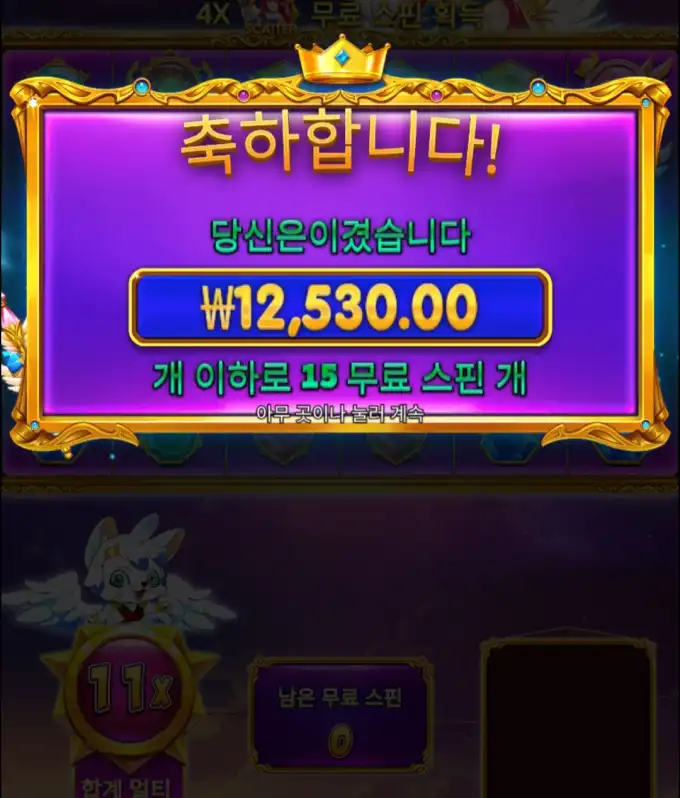 슬롯 실제 당첨내역 스크린샷 (당첨금 ₩12,530.00 / 배당 11x)