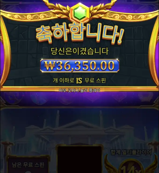 이번 건은 화면부터 좀 세게 들어오네요. 슬롯 쪽은 소액 들어가서 36350.00 나온 장면으로 읽히고, 배당도 배당 꽤 나온 편 쪽으로 보이네요.