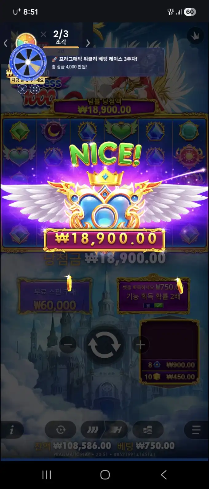 공주천바닥 플레이 장면 중 핵심 당첨 구간을 보여주는 이미지로, 베팅금 ₩750.00 / 당첨금 ₩18,900.00 정보가 같이 보입니다.